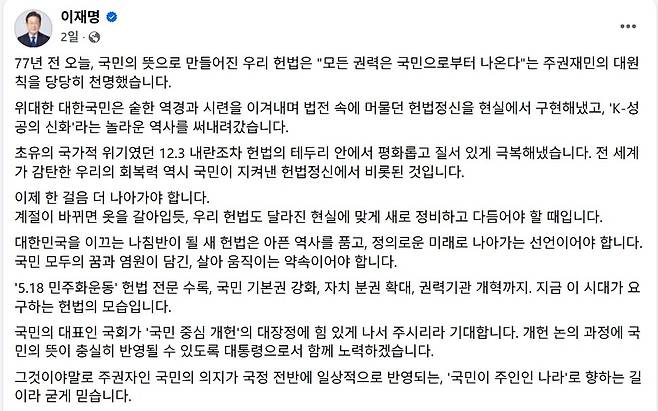 그런데 이런 패턴이 깨지는 놀라운 장면이 펼쳐졌습니다. 지난 7월 17일은 제77주년 제헌절이었습니다. 이날 오전 10시 1분 이재명 대통령이 페이스북에 글을 올렸습니다.