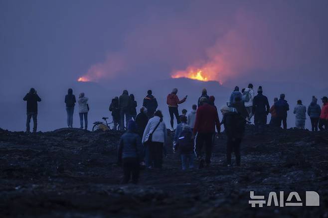 [그린다비크=AP/뉴시스] 19일(현지 시간) 아이슬란드 레이캬네스반도 그린다비크 화산이 폭발한 가운데 분화구에서 수 킬로 떨어진 언덕에 모인 관광객들이 이 모습을 지켜보고 있다. 2025.07.20.