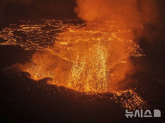 [그린다비크=AP/뉴시스] 19일(현지 시간) 아이슬란드 레이캬네스반도 그린다비크 화산이 폭발해 북쪽 분화구 인근에서 용암이 솟구치고 있다. 2025.07.20.