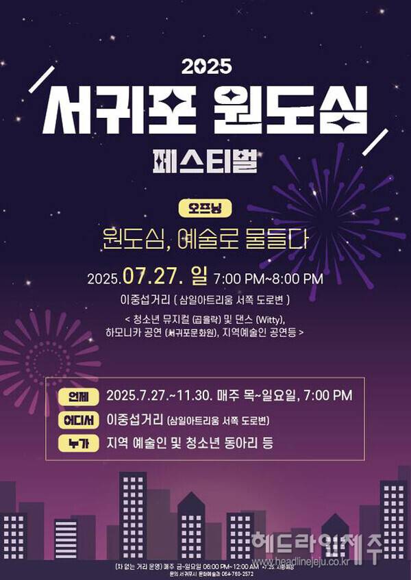 특히 이중섭거리~명동로 일대의 원도심을 중심으로 한 서귀포 원도심 문화페스티벌이 펼쳐진다. 오는 27일부터 11월까지 매주 목~일요일 저녁 7시, 청소년과 지역 예술인이 참여하는 다채로운 버스킹 공연이 총60회에 걸쳐 선보인다.