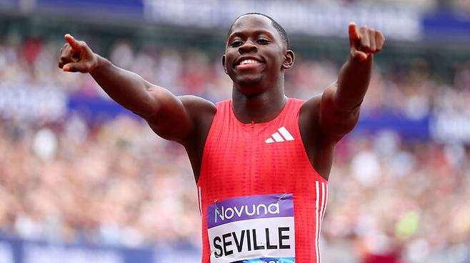 세빌은 오늘 영국 런던에서 열린 2025 세계육상연맹 런던 다이아몬드리그 남자 100m 경기에서 비에 젖은 트랙을 달려 9초86으로 가장 먼저 결승선을 통과했습니다.