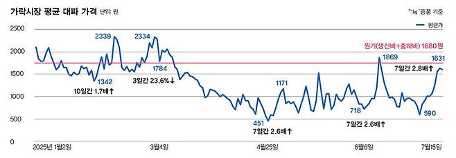 가격변동은 2025년만의 현상이 아니다. 2018년 4월5일에는 대파 도매가격이 ㎏당 396원(‘보통’ 기준)까지 떨어졌다. 개별 경매에 따라 최저가인 ㎏당 100원으로 결정되는 경우도 있었다. ‘100원 대파’라는 말까지 나왔다. 하지만 2021년 3월1일에는 ㎏당 5415원까지 치솟았다. 당시 대파 소비자가격은 1만원을 넘어, ‘금(金)파’라고 불렸다. 그렇다고 가락시장에 오지 않을 방법도 없다. 톤(t) 단위 이상 대규모 물량을 쉽게 소화할 수 있는 도매시장은 가락시장이 유일한데, 경매를 통해야만 가락시장에서 거래할 수 있기 때문이다.