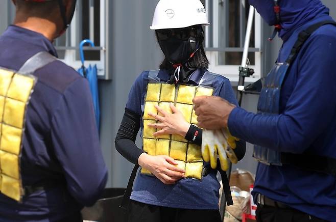 [6일 광주 북구청 신관 공사 현장에서 작업자들이 폭염에 대비해 냉조끼를 착용하고 있다. 북구는 코로나19 선별진료소에서 의료진들이 착용했던 냉조끼를 공사 작업자들에게 8월 한달간 제공할 계획이다. (광주 북구 제공=연합뉴스)]