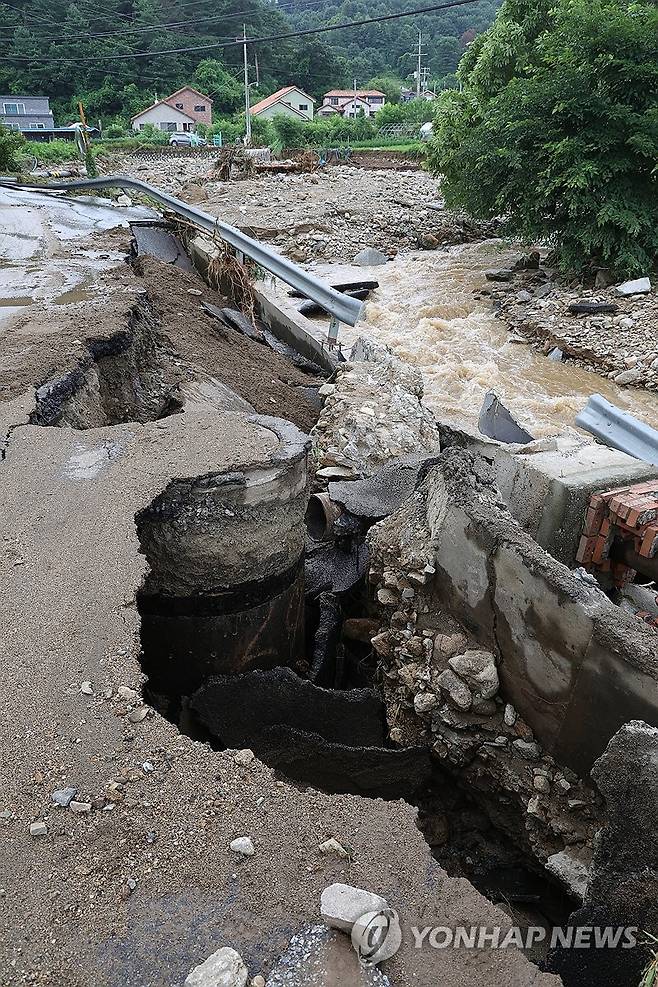 (가평=연합뉴스) 임병식 기자 = 20일 오후 경기도 가평군 조종면에서 새벽 시간에 쏟아진 폭우로 도로가 파손되어 있다. 2025.7.20