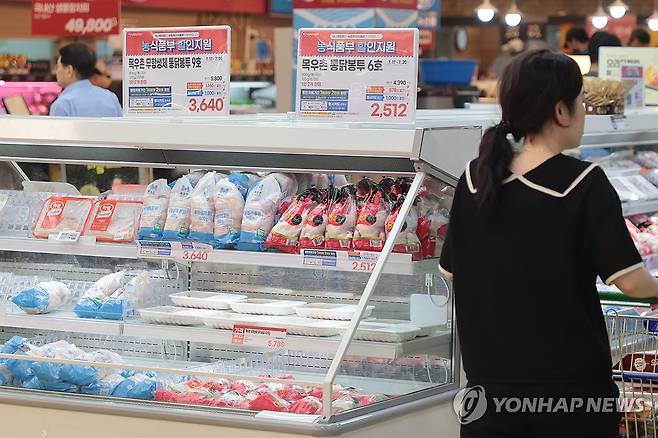 (서울=연합뉴스) 류효림 기자 = 초복인 20일 서울 서초구 양재동 하나로마트에서 시민들이 육계 제품류를 살펴보고 있다. 전통시장에서 재료를 사서 삼계탕을 직접 끓이는 데 드는 비용이 1인분에 9천원으로 5년 전보다 35% 오른 것으로 조사됐다. 전문가격조사기관인 한국물가정보가 17일 공개한 영계와 수삼·찹쌀·마늘·밤·대파·육수용 약재 등 삼계탕 재료 7개 품목의 가격을 반영한 결과다. 2025.7.20