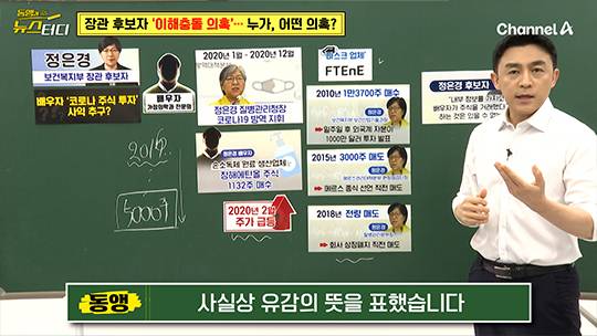 그리고 2015년에 정 후보자 배우자가 이 주식 3000주를 팔았는데, 그 직후 메르스 종식 선언이 됐습니다. 메르스 종식으로 더 이상 마스크를 쓸 필요가 없게 됐으니, 마스크 업체에는 안 좋은 소식이겠죠. 국민의힘은 “당시 정 후보자가 메르스관리대책본부 현장점검단장이었다”면서 역시나 내부 정보를 배우자가 미리 알고 주식 판 거 아니냐는 거죠.