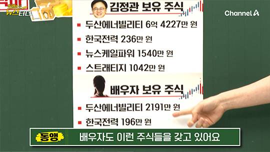 두산에너빌리티 사장 출신인 김정관 산업통상자원부 장관 후보자는, 두산에너빌리티 주식을 많이 갖고 있습니다. 요즘은 월급만 받는 게 아니라 주식이나 스톡옵션 많이 받죠. 김 후보자는 6억 원 이상의 두산에너빌리티 주식 뿐 아니라 한국전력 등의 주식도 갖고 있는데요. 배우자도 역시 이 주식들을 보유하고 있습니다.