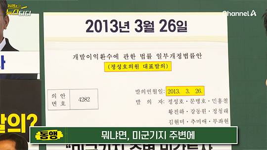 2011년 1월과 8월, 당시 정성호 변호사가 경기도 연천군 중면에 있는 땅 850평을 2천만 원 주고 매입했습니다. 그리고 국회의원에 당선된 뒤인 2013년 3월 20일에 같은 중면에 있는 땅 2200평을 3900만 원에 또 삽니다. 그리고 6일 뒤인 3월 26일에 정성호 의원이 법안을 하나 대표발의합니다. 바로, 미군기지 주변 지역 개발에 민간 투자를 활성화하기 위해 개발 부담금 등을 깎아주는 ‘개발이익 환수에 관한 법률 개정안’인데요. 정성호 의원이 산 경기 연천군 중면 땅 인근, 신서면에 주한미군 기지가 있었고, 이 내용을 포함한 개정안이 2015년 7월 국회 본회의를 통과합니다. 그리고 이 법안을 심사해 통과시킨 법사위 법안소위원장이 정성호 의원이었죠. 이 때문에 주변 지역 개발 지원으로 정 후보자가 이득을 본 것 아니냐, 자신의 사익을 위해 법안 발의를 했던 것 아니냐는 이해충돌 의혹이 제기됐는데요.