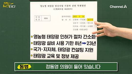 이 법안은 농사 짓는 사람은 태양광 사업을 조금 더 쉽게 할 수 있도록 해주는 게 핵심입니다. 인허가 절차도 간소화해주고 설비 사용 기한 더 늘려주고, 태양광 컨설팅과 교육을 지원해 주는 내용이 포함됐는데요. 이번 검증 과정에서 봤더니 정동영 후보자 가족들이 태양광 사업을 하고 있었던 거죠.