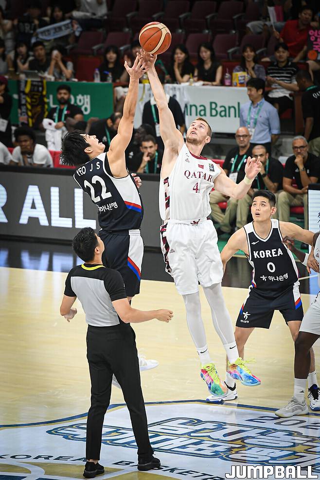 [점프볼=안양/박상혁 기자] 20일 안양 정관장 아레나에서 열린 하나은행초청 2025 남자농구 국가대표 평가전' 한국과 카타르의 2차 평가전, 점프볼로 경기가 시작되었다.