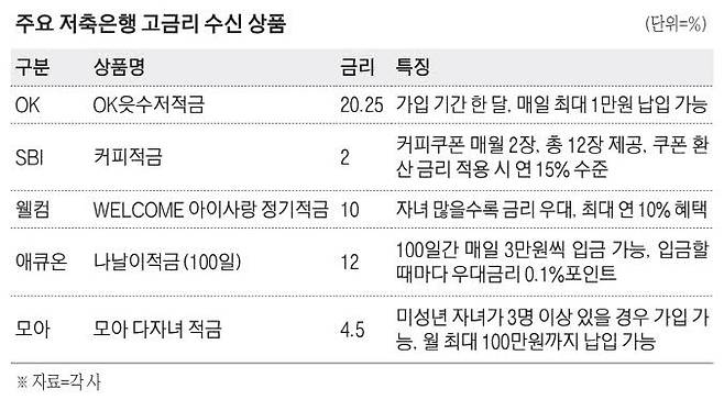 SBI저축은행은 MZ세대를 겨냥해 지난달 '사이다뱅크 커피적금'을 출시했다. 월 10만원씩 6개월간 납입하면 기본금리 연 2%에 메가커피 쿠폰 12장을 추가로 제공해 사실상 연 15%에 달하는 혜택을 누릴 수 있다. 이 상품은 7~9월 매월 1만 명 한정 판매되며, 7월 판매분은 하루 만에 소진될 정도로 반응이 뜨겁다.