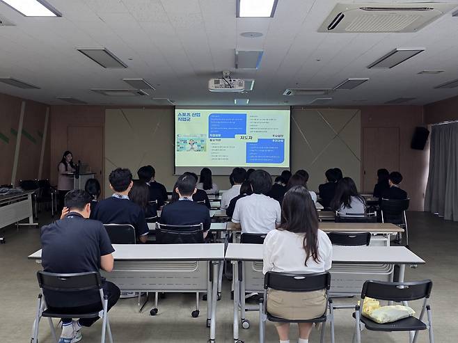 이날 첫 순서는 충남아산FC 홍보마케팅팀 손혜영 사원의 진로 특강으로 시작됐다. 강연에서는 구단 소개, 마케팅 전략, 사회공헌활동 등 구단 프런트가 수행하는 실무 전반과 이에 필요한 핵심 역량에 대한 설명이 이어졌다. 강연 후에는 자유로운 질의응답으로 스포츠 산업에 대한 궁금증을 해소하는 시간을 가졌다.