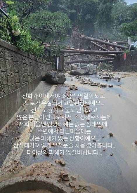 서효림은 "전기도 끊기고 물도 안 나오는 상황이다. 많은 분들이 연락 주셔서 감사드린다. 다행히 저희 마을엔 인명 피해는 없다"며 "하지만 주변 다른 마을은 많은 피해가 있는 상황"이라고 전했다.