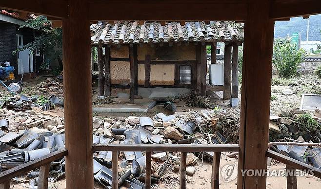 (합천=연합뉴스) 박정헌 기자 = 20일 경남 합천군 가회면 봉기마을 한 주택 앞 담벼락이 집중호우로 무너져 있다. 2025.7.20