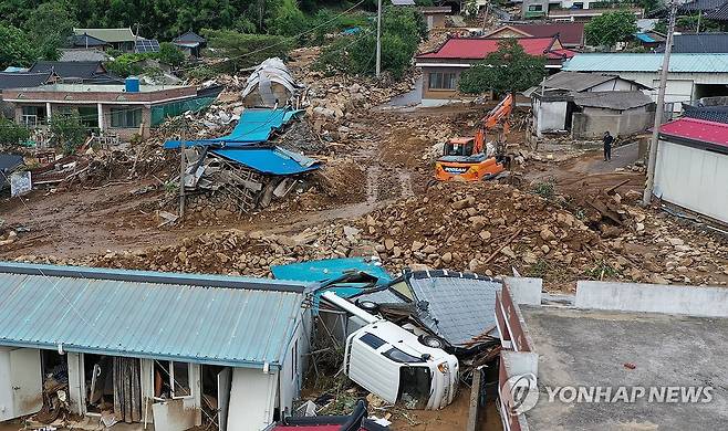 (산청=연합뉴스) 김동민 기자 = 20일 오후 경남 산청군 산청읍 외정마을에서 전날 집중호우와 산사태 영향으로 주택이 파손되고 트럭이 전복되는 등 큰 피해가 발생했다. 2025.7.20