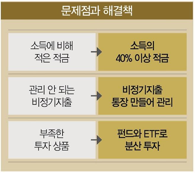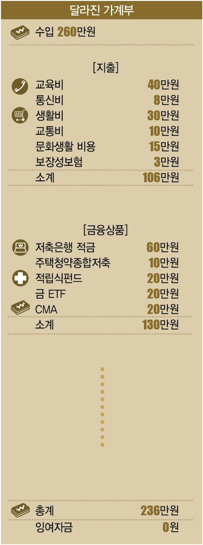 남은 40만원은 투자 상품에 넣기로 했다. 20만원은 적립식펀드(고배당가치주펀드)에, 20만원은 금 ETF(상장지수펀드)에 분배했다. 고배당가치주펀드는 이재명 정부가 상법 개정안을 제정하는 등 기업의 가치를 높이는 정책에 나서고 있다는 점을 반영해 선택했다. 금 ETF는 미국의 상호관세 정책과 글로벌 지정학적 리스크를 감안했을 때 투자전망이 밝다고 판단했다.