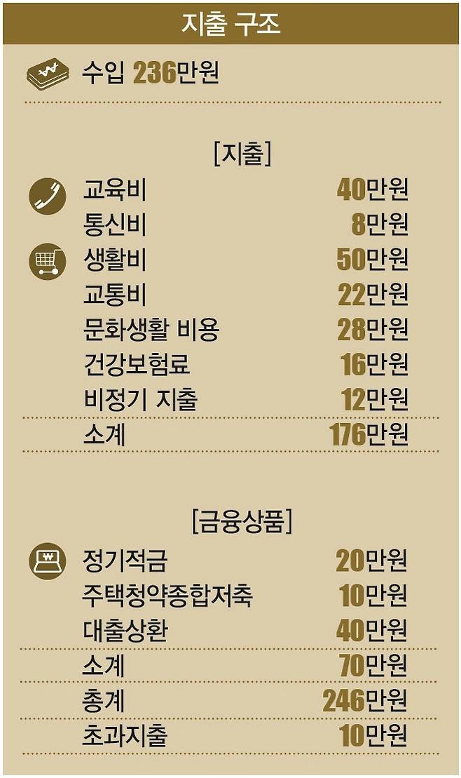 비소비성 지출로는 학자금 대출상환 40만원, 정기적금 20만원, 주택청약종합저축 10만원 등이 있다. 지민씨는 현재 매월 246만원(소비성 지출 176만원+비소비성 지출 70만원)을 지출하고 있다. 소득이 월 236만원이니까 매월 10만원씩 적자가 발생하는 셈이다.