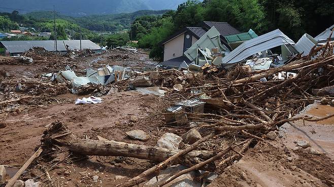 ▲ 전날 내린 폭우와 산사태로 피해를 입은 경남 산청군 산청읍 부리 내부마을 20일 오후 모습