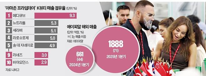 메디큐브 브랜드를 보유한 에이피알은 해외에서 승승장구하며 주목받고 있다. 올해 1분기 기준 해외 매출은 1888억원으로 회사 전체 매출의 71%를 차지할 정도다. 해외 매출 자체도 전년 동기 대비 186% 치솟았다. 조경진 IBK투자증권 연구원은 “뷰티 제품과 디바이스가 고루 성장해 3분기 미국 매출은 1000억원을 넘길 것으로 내다봤다.