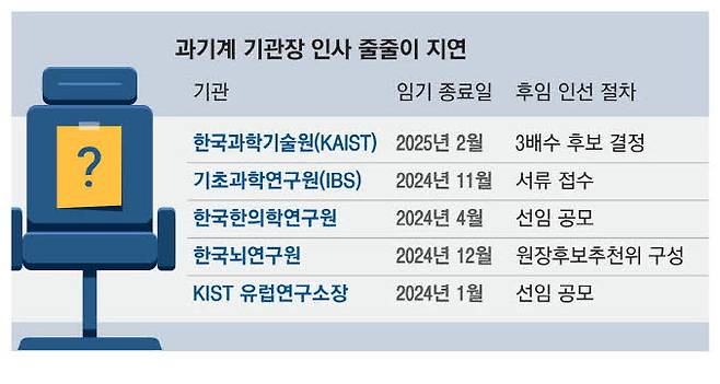 한국을 대표하는 기초과학 연구기관인 IBS도 상황은 비슷하다. 노도영 IBS 원장 임기는 지난해 11월 만료됐다. 약 8개월째 의도치 않은 임기를 수행하고 있다. IBS는 한 해 수천억 원의 예산을 쓰는 기관이다. 임기가 만료된 기관장이 계속 자리에 앉아 있으면서 기관 레임덕에 빠질 수 있다는 우려가 제기된다. IBS 원장 선임은 원장후보자추천위원회가 구성돼 후보 3인을 선정하고 과기정통부에 보고하는 과정을 거친다. 이후 과기정통부 장관이 대통령에 제청해 임명된다. 그러나 원장후보자추천위는 '개점휴업' 중이다.
