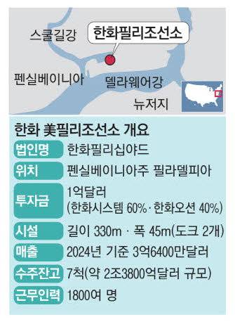 필리조선소는 1997년 미국 민관 합작 프로젝트의 일환으로 필라델피아 해군조선소 용지에 설립됐다. 이곳은 2003년 이후 선박 32척을 인도하며 미국 내 상업용 선박 건조 물량의 50%를 담당해왔다. 그러나 2019년에 건조 활동이 일시 중단되는 등 경영난을 겪자 한화가 미국 상선·군함 건조 시장 진출을 목표로 1억달러(약 1400억원)에 인수했다. 지분율은 한화오션 40%, 한화시스템 60%다. 한화오션은 한화필리조선소를 전략 거점으로 삼아 북미 지역 특수선 시장 개척, 미국 신규 선박 수요 대응에 나설 방침이다.
