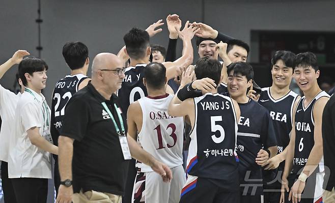 (서울=뉴스1) 김진환 기자 = 20일 오후 경기도 안양 정관장 체육관에서 열린 하나은행 초청 2025 남자농구 국가대표 평가전 대한민국과 카타르의 경기에서 95대78 승리를 거둔 대한민국 대표팀 선수들이 기쁨을 나누고 있다. (대한농구협회 제공, 재판매 및 DB 금지) 2025.7.20/뉴스1