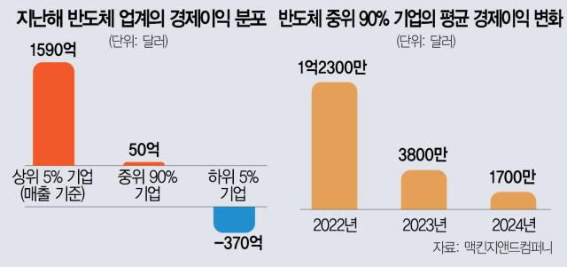 시장 판도가 바뀐 것은 불과 2~3년 만이다. 코로나19 팬데믹 기간(2021년~2022년) 반도체 공급 부족으로 인해 중위 90% 기업들이 가져간 경제적 이익은 연간 300억 달러를 웃돌았다. 기업당 평균 이익으로 환산하면 1억 3000만 달러 수준이다. 그러나 AI 반도체 붐이 일기 시작한 2023년 이들 기업의 평균 이익은 3800만 달러로 급격히 내렸다. 지난해에는 1700만 달러까지 하락하며 2년 만에 88%가량 이익이 줄었다.