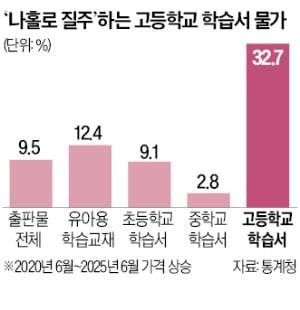 20일 통계청의 ‘2025년 6월 소비자물가동향’에 따르면 지난달 고등학교 학습서 물가는 전년 동월 대비 7.4% 상승했다. 기간을 넓혀보면 코로나19가 본격화한 2020년 6월부터 올 6월까지 5년간 32.7% 뛰었다. 유아용 학습교재(12.4%), 초등학교 학습서(9.1%), 중학교 학습서(2.8%)를 크게 앞질렀다.