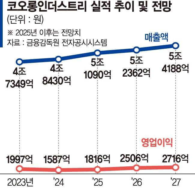 최근 3개월간 주요 증권사들이 제시한 추정치 평균에 따르면, 코오롱인더스트리의 영업이익은 △2025년 1816억원 △2026년 2506억원 △2027년 2716억원으로 점진적인 회복세를 보일 것으로 예상된다. 이 기간 연평균 성장률은 약 16%에 달한다. 매출 역시 내년 5조원대를 회복한 뒤 오는 2027년까지 4년 연속 증가세를 이어갈 것으로 기대된다.