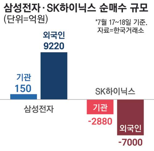 20일 한국거래소에 따르면 외국인투자자들은 지난 17일부터 2거래일간 삼성전자를 9220억원어치 순매수했다. 외국인투자자들은 같은 기간 SK하이닉스를 7000억원어치를 팔아치우면서 기존의 ‘삼성전자 숏, SK하이닉스 롱’과 정반대의 행보를 보였다.