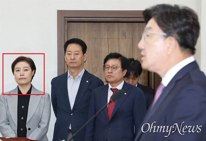 | ▲ 국민의힘 박형수 원내수석부대표, 최은석 원내대표 비서실장, 서지영 원내대변인(강조박스 안)이 12일 서울 여의도 국회에서 열린 권성동 원내대표의 퇴임 기자회견에 배석해 있다. |