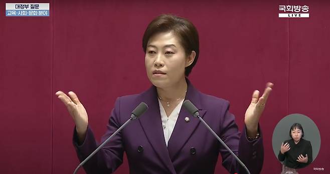 | ▲ 서지영 국민의힘 의원(초선. 부산 동래구)이 2025년 4월 16일 교육·사회·문화 분야 국회 대정부질문에서 이재명 민주당 대선후보의 '형수 욕설' 논란을 비꼰 발언을 했다. 그는 당시 민주당 의원들의 항의에 "저는 누구라고 얘기하지 않았다. 왜 여러분이 흥분하십니까"라고 말했다. |