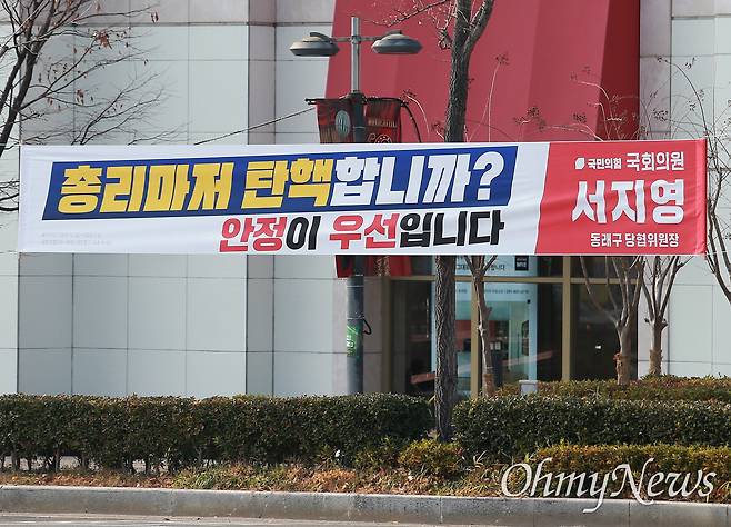| ▲ 12.3 내란 사태와 윤석열 대통령 탄핵을 둘러싸고 2024년 12월 26일 부산시 동래구에 국민의힘 서지영 국회의원의 '총리마저 탄핵합니까? 안정이 우선입니다'라는 내용의 펼침막이 부착돼 있다. |
