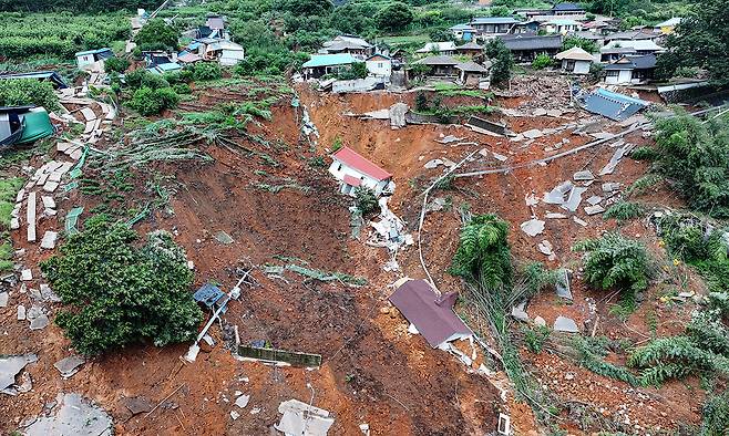 산사태가 앗아간 삶의 터전 20일 경남 산청군 생비량면 상능마을 일부가 전날 발생한 산사태로 토사 등에 묻히거나 지붕 등 주택 잔해만 나뒹굴고 있다. 올 3월 말 대형 산불이 휩쓸고 간 산청에는 20일 오전 10시까지 지난 닷새간 793.5㎜의 물폭탄이 쏟아졌다. 산청=뉴스1