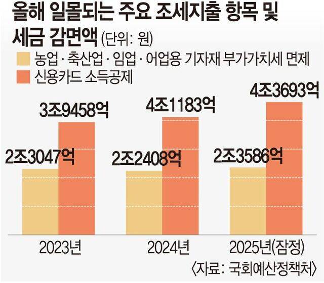 정부가 신용카드 소득공제와 농·어업인 대상 부가가치세 면제를 연장하기로 했다. 두 조세 특례의 세금 감면액은 연 6조원이 넘는다. 정부가 지출 구조조정을 강조하면서도 한편으론 수혜층 반발을 의식해 이에 소극적인 모습을 보인다는 지적이 나온다.