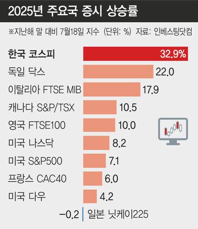 다만 주요 7개국 대표지수와 코스피의 올해 상승률을 비교해보면, 코스피가 압도적으로 높다. 코스피는 32.9%나 올랐다. 주요 7개국 증시 가운데는 독일 닥스 지수가 22.0% 올라 상승률이 가장 컸고, 이탈리아 FTSE MIB지수가 17.9% 올라 뒤를 이었다. 캐나다 S&P/TSX(10.5%), 영국 FTSE100(10.0%)도 10% 넘게 올랐다. 미국 증시는 나스닥지수가 8.2%, S&P500지수가 7.1% 올랐고, 다우지수가 4.2% 상승에 그쳐 상대적으로 수익률이 떨어졌다. 일본의 닛케이225지수는 0.2% 떨어져, 유일하게 하락했다.