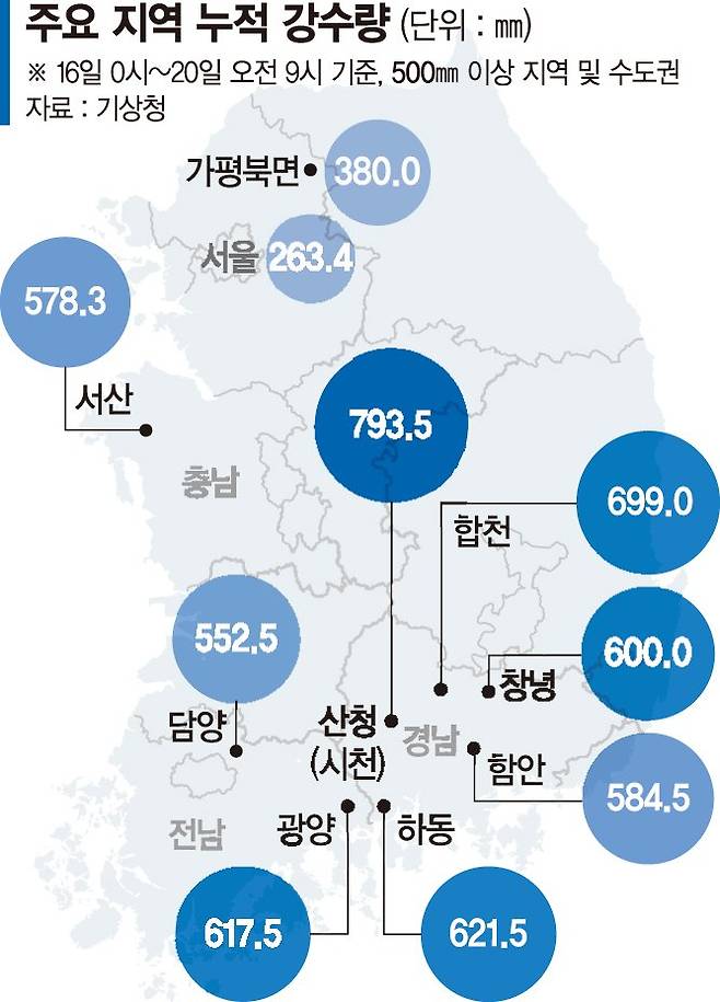 강수량도 경남에 집중됐다. 경남 산청이 793.5㎜를 기록해 가장 많았고 경남 합천(699.0㎜), 경남 하동(621.5㎜), 전남 광양(617.5㎜), 경남 창녕(600.0㎜), 경남 함안(584.5㎜) 순이었다.