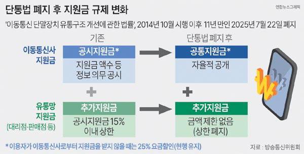 22일부터 국내 이동통신사의 휴대전화 지원금 공시 의무가 폐지된다. 또 대리점 판매점 등 유통점의 추가지원금 상한도 사라진다. 공시지원금 추가지원금이 늘어날 가능성이 크지만 통신시장은 3사 과점 상태기 때문에 요금제 담합 가능성이 있고 지원금을 높이는 대신 통신요금을 올리거나 의무 사용 기간을 늘리는 ‘조삼모사’식 요금제 책정 등 폐해도 예상된다.