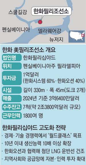 필리조선소는 1997년 미국 민관 합작 프로젝트의 일환으로 필라델피아 해군조선소 용지에 설립됐다. 이곳은 2003년 이후 선박 32척을 인도하며 미국 내 상업용 선박 건조 물량의 50%를 담당해왔다. 그러나 2019년에 건조 활동이 일시 중단되는 등 경영난을 겪자 한화가 미국 상선·군함 건조 시장 진출을 목표로 1억달러(약 1400억원)에 인수했다. 지분율은 한화오션 40%, 한화시스템 60%다. 한화오션은 한화필리조선소를 전략 거점으로 삼아 북미 지역 특수선 시장 개척, 미국 신규 선박 수요 대응에 나설 방침이다.