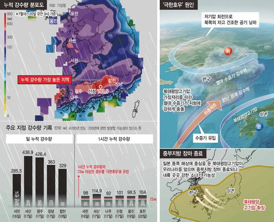 지난 16일부터 나흘 동안 지역을 바꿔가며 ‘널뛰듯’ 떨어진 극한호우로 전국 13곳에서 역대 7월 하루 최대 강수량 기록이 바뀌었다. 16일 충남 서산시에 내린 일 누적강수량 438.9㎜, 20일 경기도 포천시에 내린 1시간 누적강수량 104㎜ 등은 200년에 한번 발생할 정도로 드문 기록으로 나타났다. 역대급 폭우가 끝난 뒤인 다음주엔 다시 폭염과 열대야가 찾아올 전망이다.