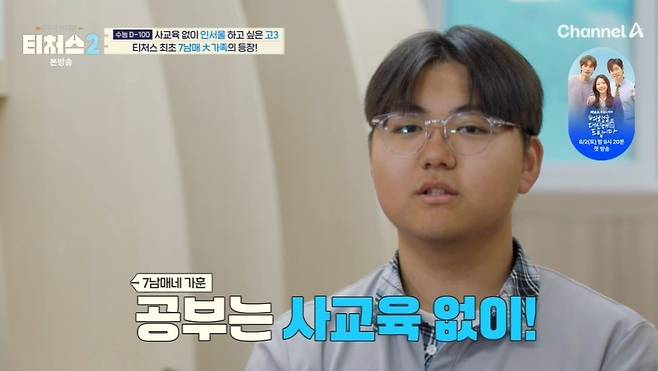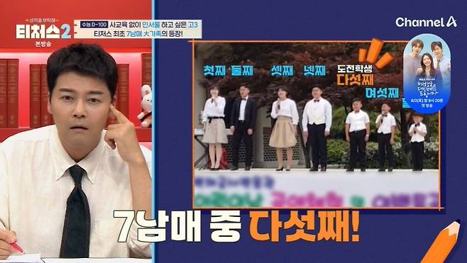 도전 학생은 7남매 중 다섯째로, '티처스' 최초 7남매 가족의 등장이었다. 도전 학생은 "공부만큼은 사교육 없이 공교육으로 하자는 주의다. 형, 누나 모두 혼자 공부에 대학에 입학했고, 저도 고3까지 단 한 번도 학원에 다니지 않았다. 수능이 가까워지는 데 도움을 청할 때도 마땅치 않고, 혼자 공부하려니 버겁다"라고 털어놓았다. 목표는 인서울로, 독립의 로망이 있기 때문.