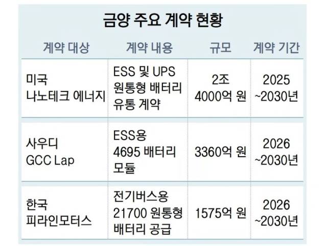 공장이 완공되더라도 거래가 없다면 무용지물이다. 금양이 밝힌 체결된 계약은 3건이다. 2조 4000억 원 규모로 미국 나노테크 에너지와 맺은 ESS(에너지저장장치) 및 UPS(무정전 전원장치)용 원통형 배터리 장기 유통 계약, 3360억 원 규모로 사우디아라비아 GCC Lap과 맺은 ESS용 4695 원통형 배터리 모듈 공급 계약, 1575억 원 규모로 한국 피라인모터스와 맺은 전기버스용 21700 대용량 원통형 배터리 공급 계약 등이다. 이 중 나노테크 에너지와 맺은 계약은 2025~2030년까지고, 나머지 2건은 2026~2030년까지다.