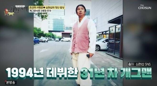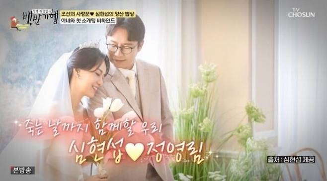 20일 저녁 TV CHOSUN '식객 허영만의 백반기행'에서는 올해 데뷔 31년 차를 맞은 심현섭과 아내 정영림이 허영만과 경남 양산을 찾는 모습이 그려졌다. 지난 4월 결혼한 심현섭은 같은 방송사 프로그램 '조선의 사랑꾼'에서 103번째 소개팅으로 11세 연하 영어 강사 정영림을 만나 결혼에 골인했다.