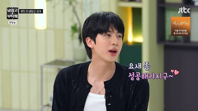 이날 진의 냉장고에서 연어, 광어, 참돔, 참치로 구성된 모둠회가 등장하자 진은 "사실 항상 있는 친구는 아니고, 냉장고가 너무 텅텅 이어서 배달시켰다"고 솔직하게 답했다.