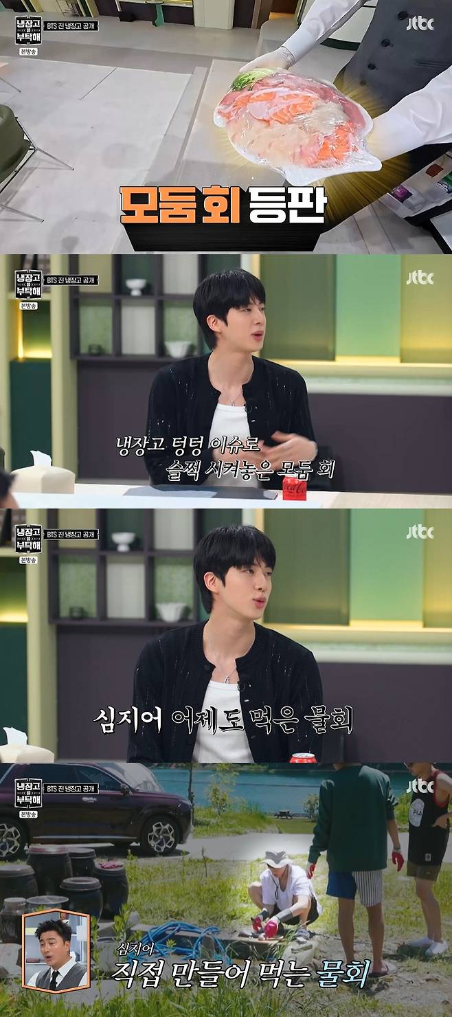 BTS 진의 냉장고에서 모둠회와 킹크랩찜이 발견됐다.