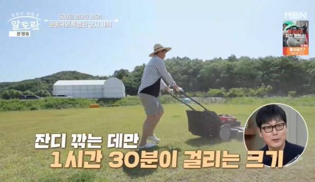 송종국은 "천천히 하면 1시간 30분 걸리고 뛰면서 깎으면 1시간 걸린다"고 했다. 이어 텃밭에서 직접 키우는 채소들을 돌봤다.