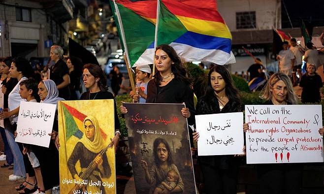 | “스웨이다 지역 드루즈족 보호를” 이스라엘이 점령한 시리아 영토 골란고원의 마즈달샴스에서 19일(현지시간) 드루즈족을 상징하는 깃발을 든 여성과 어린이들이 국제사회와 인권단체 등을 향해 스웨이다 지역 드루즈족을 보호해 달라고 촉구하고 있다. 마즈달샴스=AFP연합뉴스 |