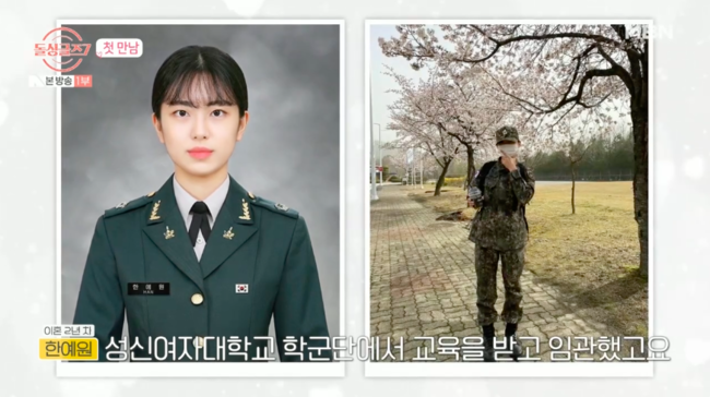 특히 한예원은 “저는 육군 장교로 복무를 3년 정도 하다가 성신여자대학교 학군단에서 교육받고 임관해서 작년 7월에 전역했다”라고 밝혀 눈길을 끌었다.