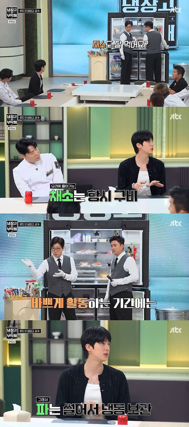 20일 방송된 JTBC '냉장고를 부탁해'(냉부해)에서는 '월드 와이드 핸섬' BTS 진과 풋풋한 신혼 생활 중인 '사랑꾼' 조세호가 게스트로 출연했다.