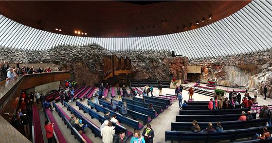종교개혁가 마르틴 루터의 사상을 따르는 루터교회는 핀란드를 비롯한 북유럽에서 국교와 같은 위상을 갖는다. 헬싱키의 신도시, 퇼뢰에 교구 교회가 필요해 1930년대 건설을 추진했으나 2차대전의 발발로 무산되었다. 1961년 재추진된 현상 경기에서 수오말라이넨 형제 건축가의 안을 채택해 1969년 템펠리아우키오 교회로 헌당했다. ‘성전의 광장’이라는 뜻이며 ‘암석 교회’라는 별명으로 더 유명하다.